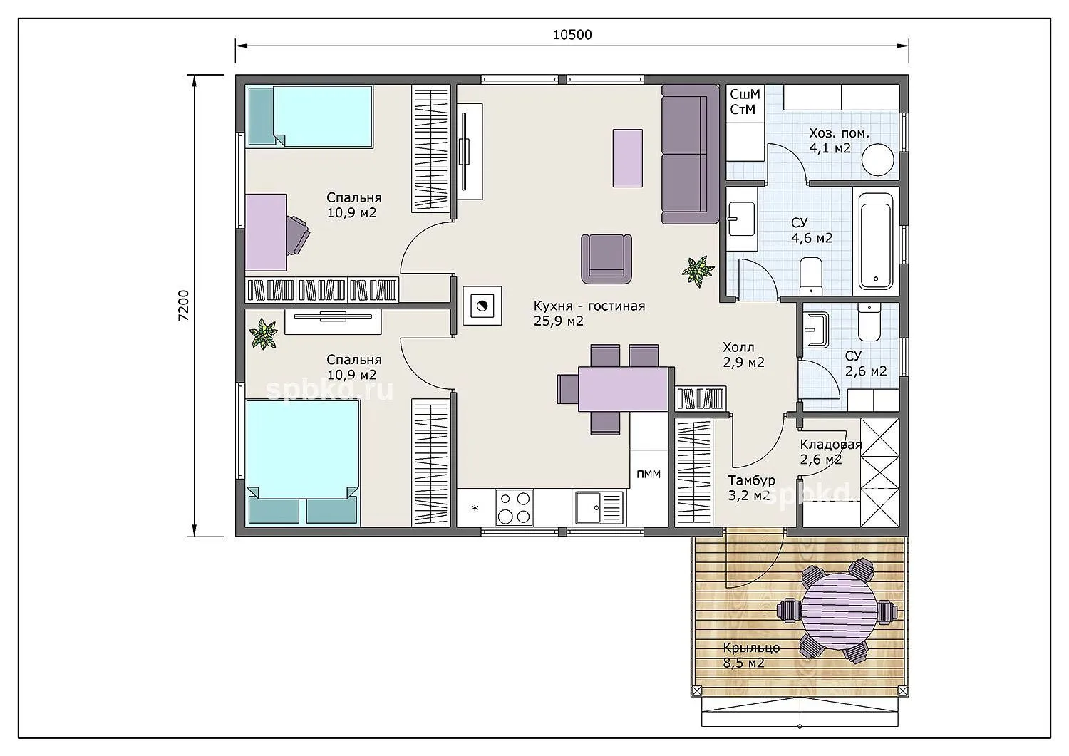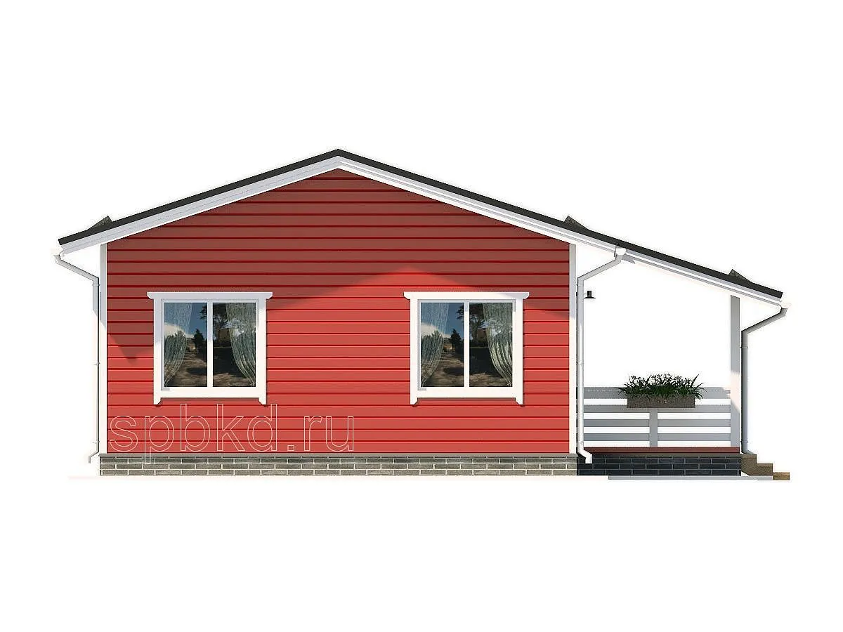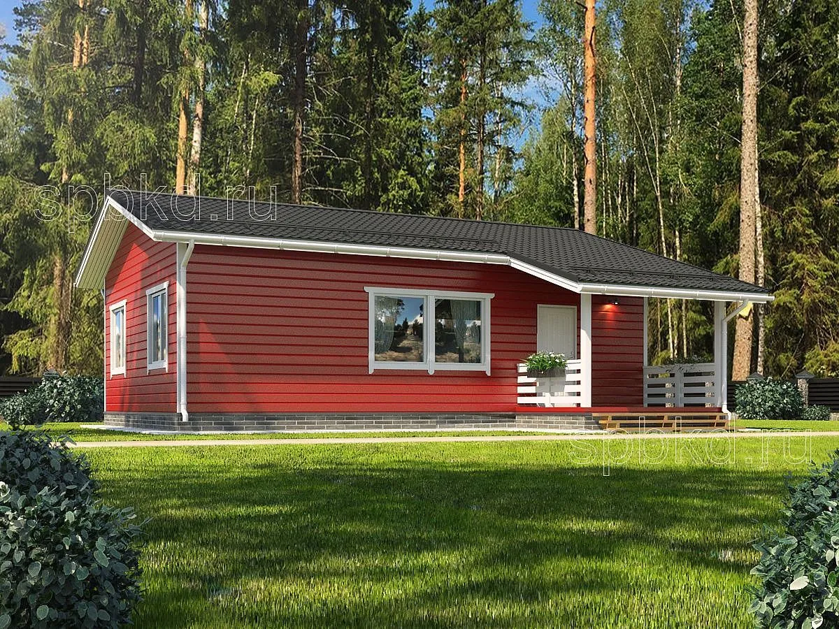 Если вы планируете строительство загородного дома с небольшими габаритами и интересной планировкой, тогда современный одноэтажный коттедж с размерами 8х8 - оптимальное решение для вас. Данное решение идеально в формфакторе одноэтажного дома - судите сами, в одноэтажном каркасном доме вы не тратите деньги на лестницу (в доме с мансардой на вылет уходит 8м2 на мансарду и первый этаж), имеете лаконичный внешний вид и продуманную планировку, не завязанную на лестничный проем. Каркасный дом с габаритными размерами 8х8 включает в себя 2 изолированные спальни, прихожую, котельную, санузел и кухню-гостиную. Обратите внимание на планировки - мы предлагаем 3 варианта на выбор. В одном из вариантов мы сделали изолированную кухню для любителей засидеться за чашечкой чая допоздна. Интересной особенностью проекта является проходная котельная - по сути в данном проекте два СУ и вечерние очереди для чистки зубов исключены. В котельной с лёгкостью разместится и стиральная машина.